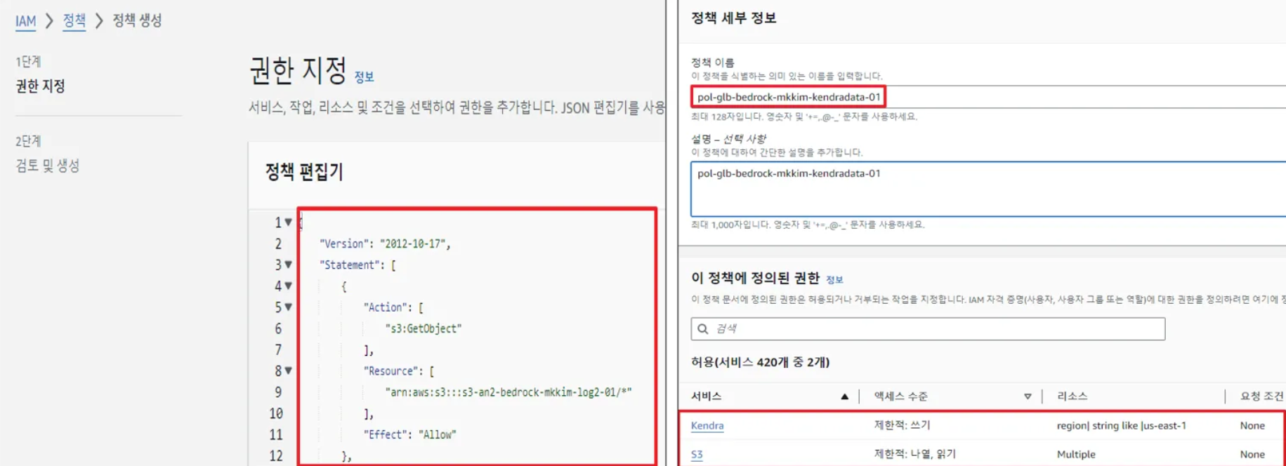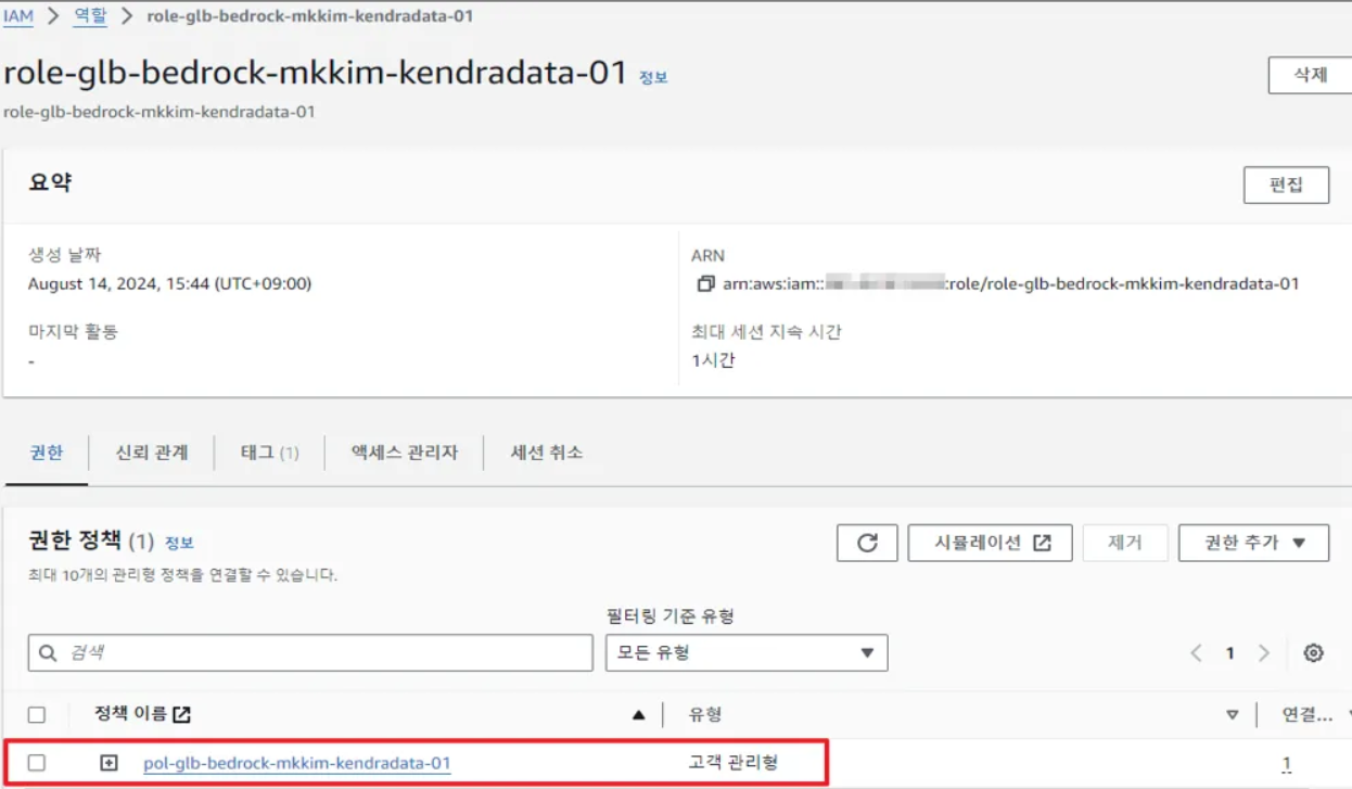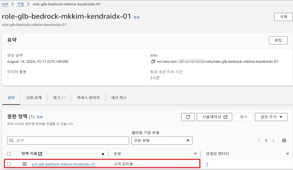 - Kendra 데이터 소스(Data Source) 역할(Role)에 정책(Policy) 연결