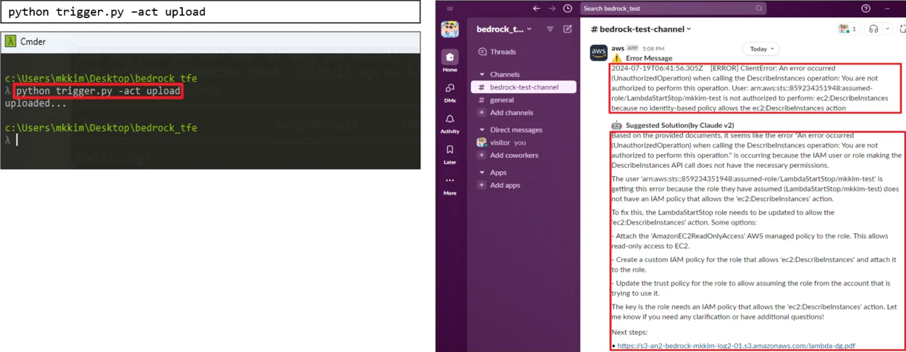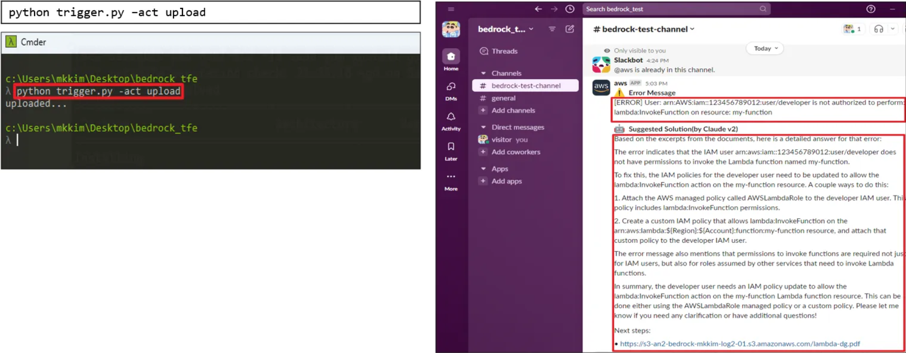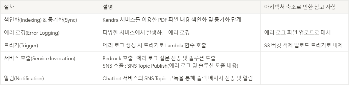 아래에서는 AWS 서비스에서 에러가 발생했을 때, RAG 기술을 사용하여 S3에 저장된 PDF 문서를 기반으로 에러 로그와 관련된 정보를 Amazon Bedrock 통해 질문하고, 장애에 대한 솔루션을 AWS Chatbot 서비스를 통해 Slack으로 자동으로 받아보는 간단한 ChatOps 구축 예시를 정리하였습니다.