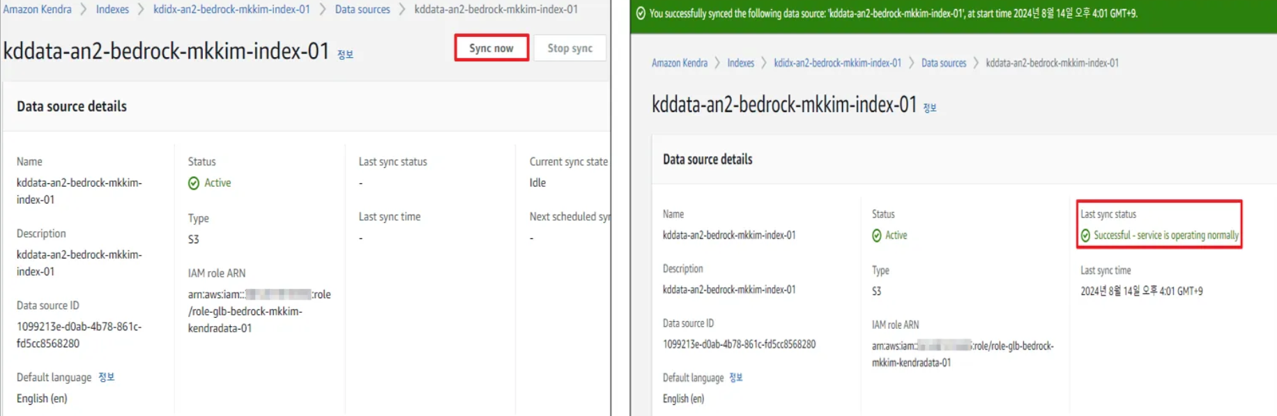 - Kendra 데이터 소스(Data Source) 동기화 및 동기화(Sync) 확인
